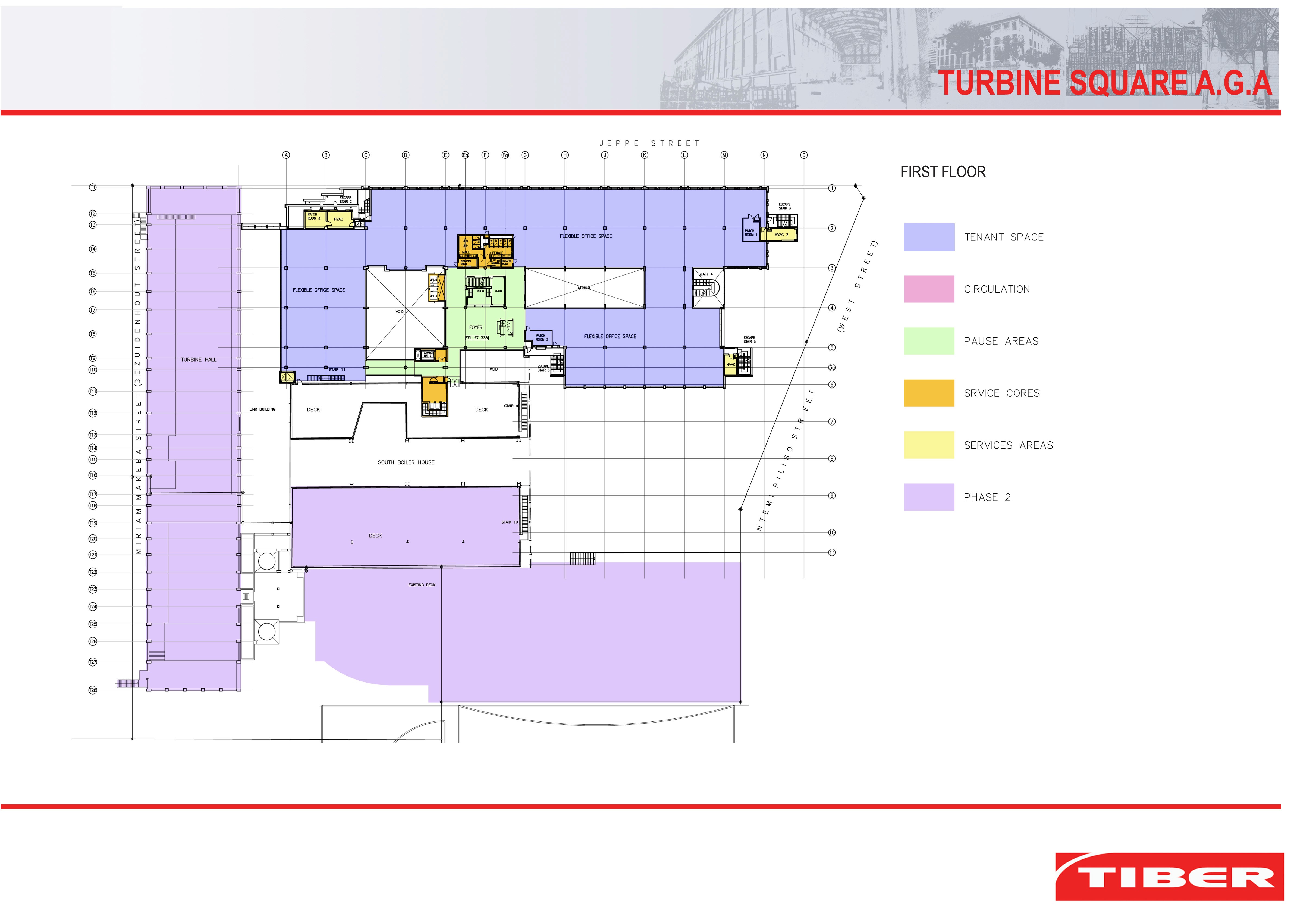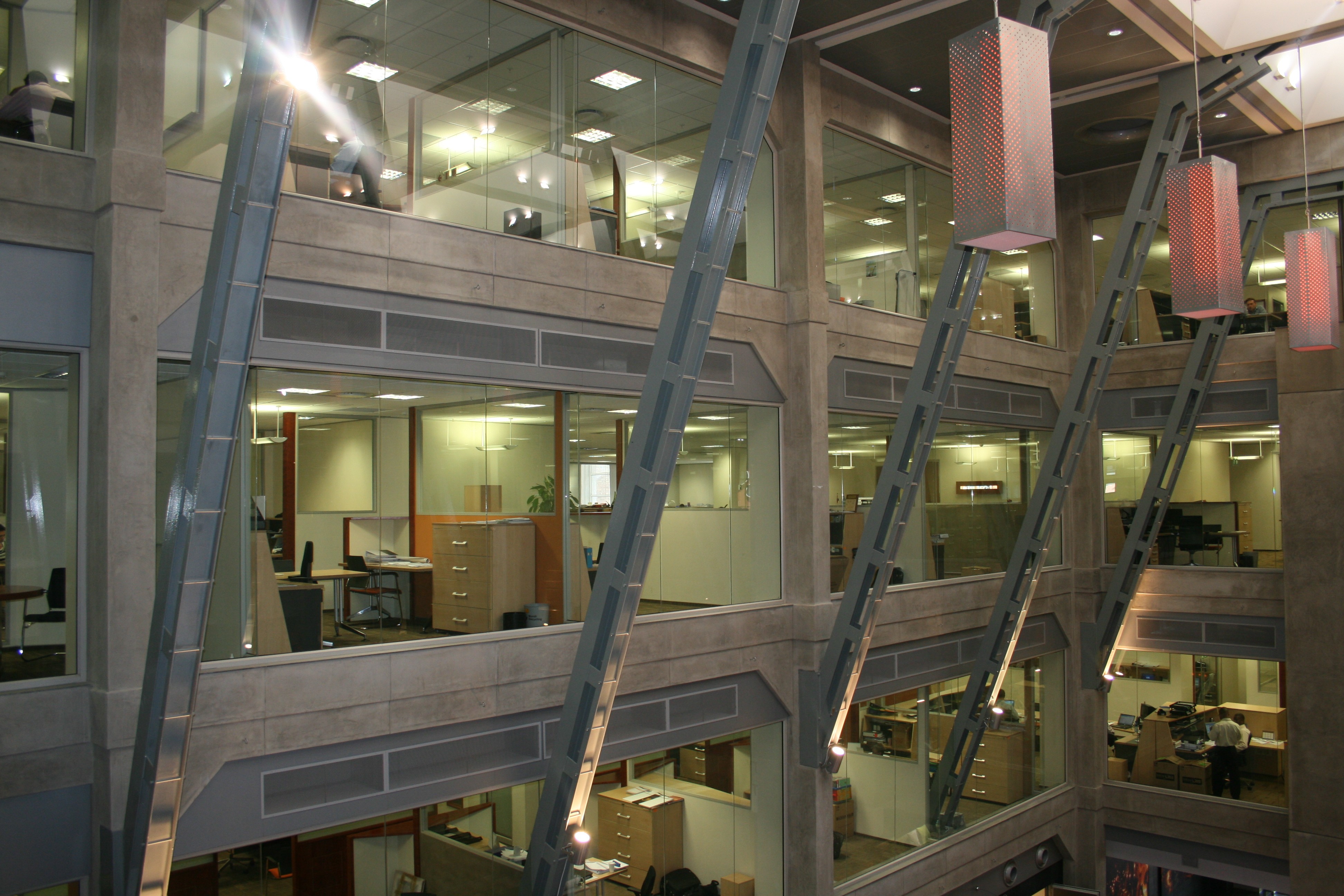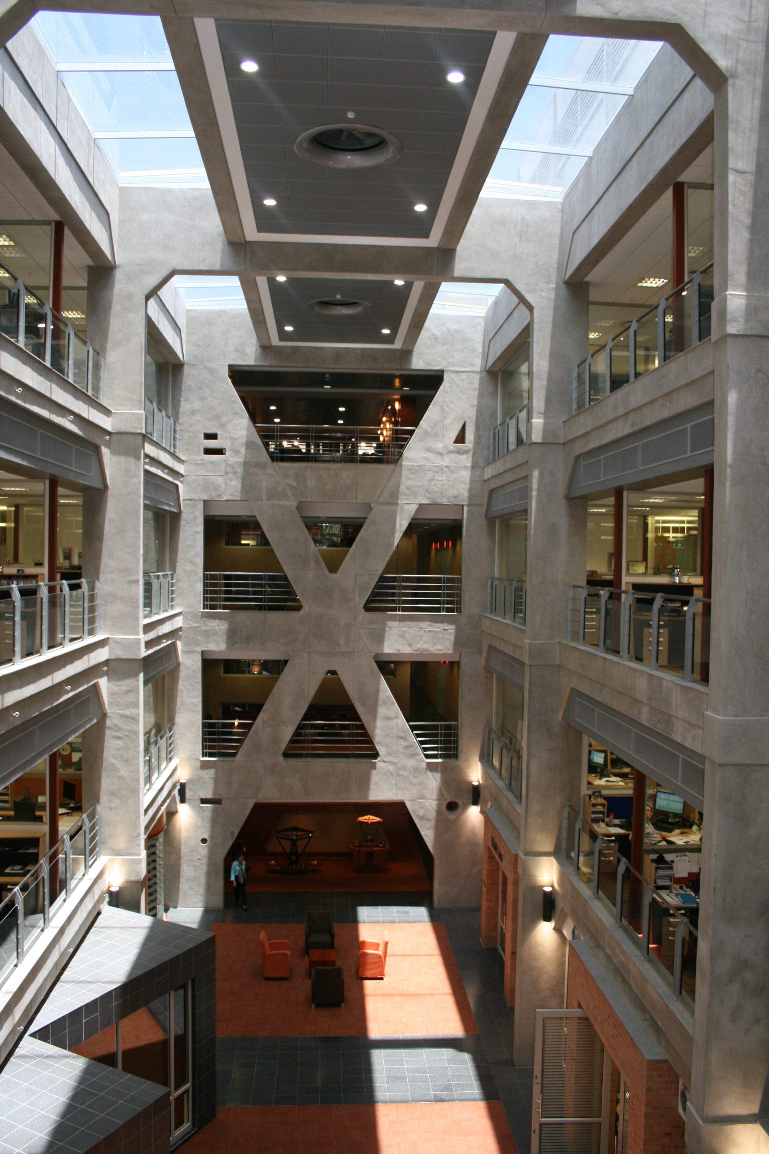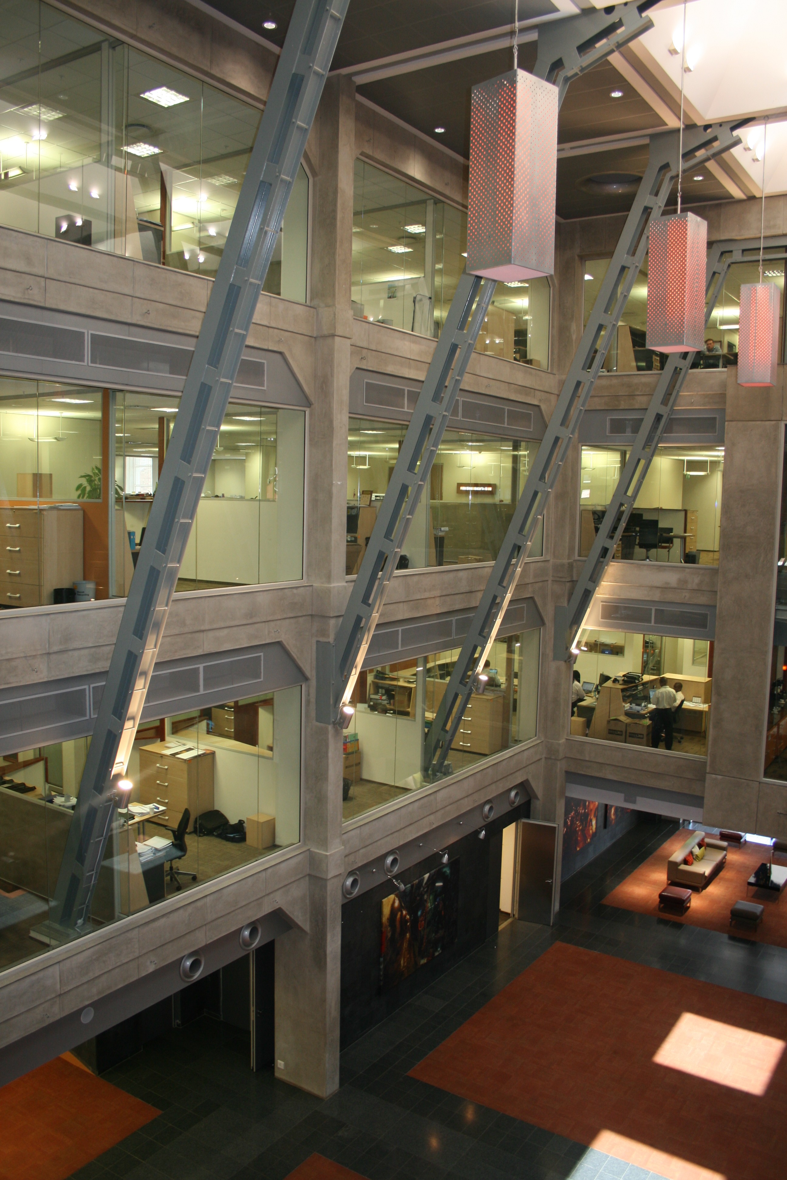 The fundamental concept behind the development was to create a “fat, flat and walk-up” modern functional office for the tenant, preserving as far as possible the “ethos” of the existing power station complex. This was achieved through the demolition of one of the existing structures to make space for the new building and the subterranean parking structure. The offices are arranged in a “figure of eight” plan around two atria, and integrates well with the Turbine