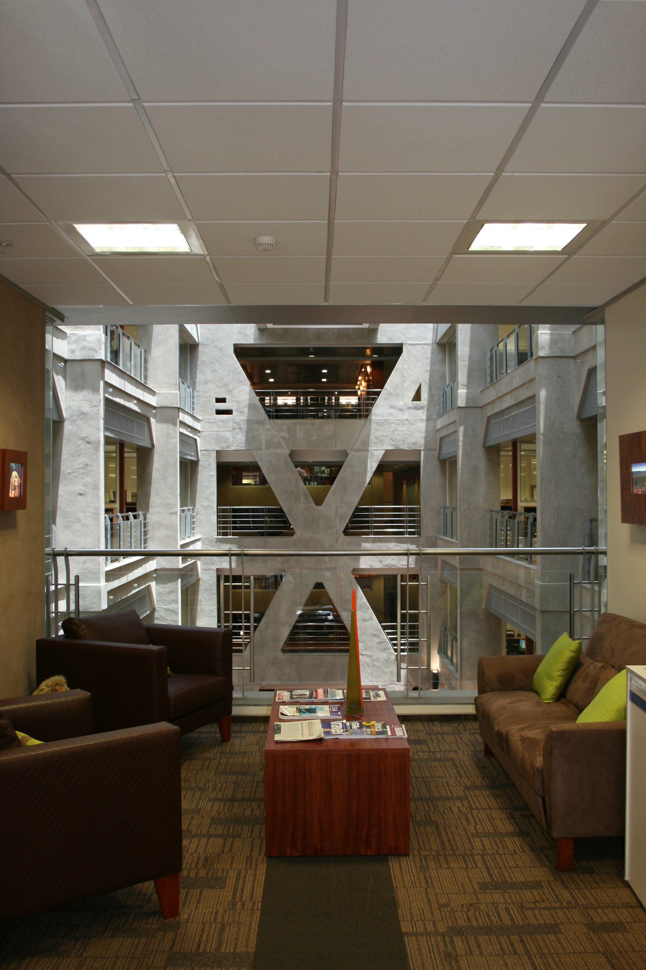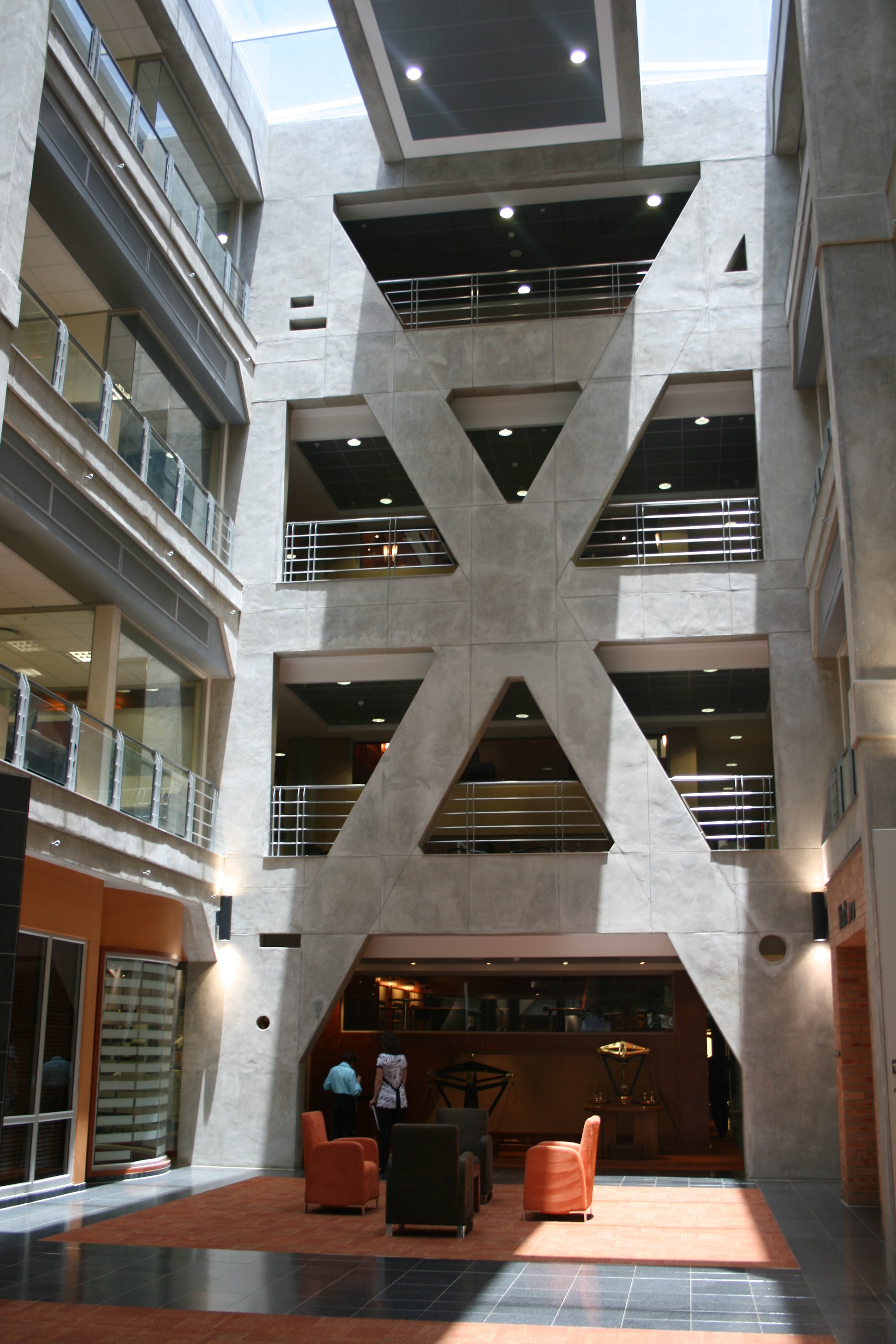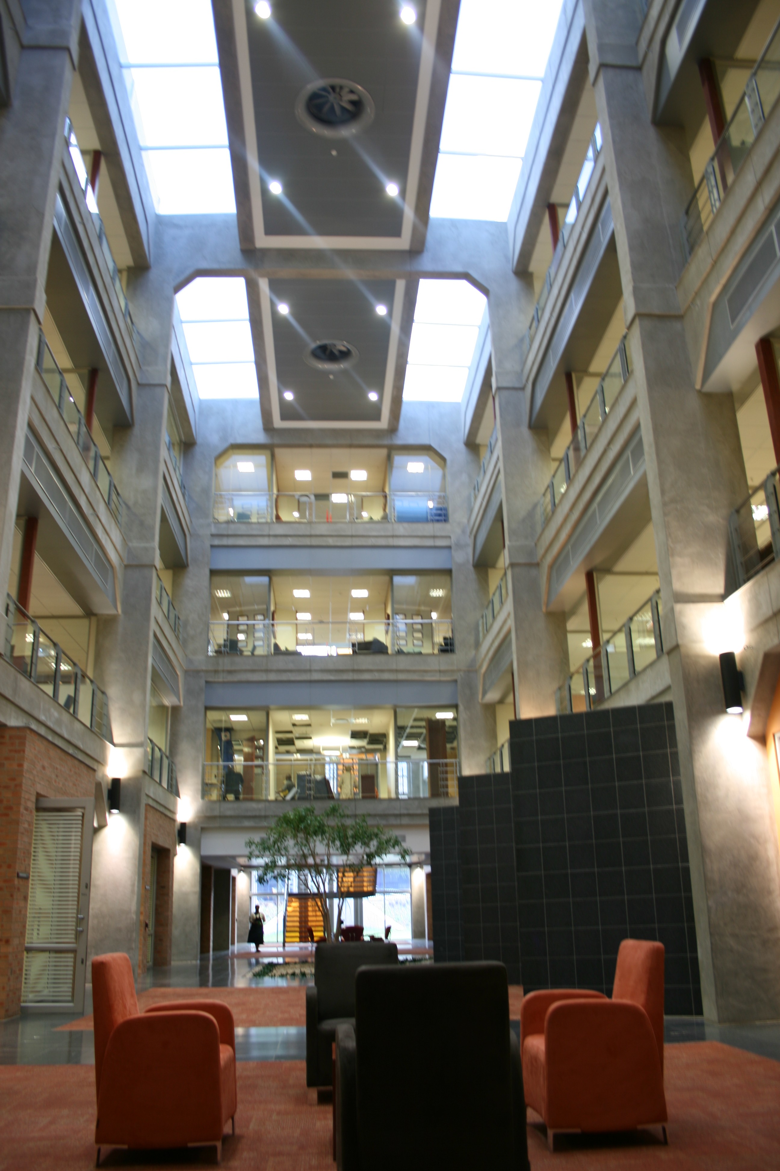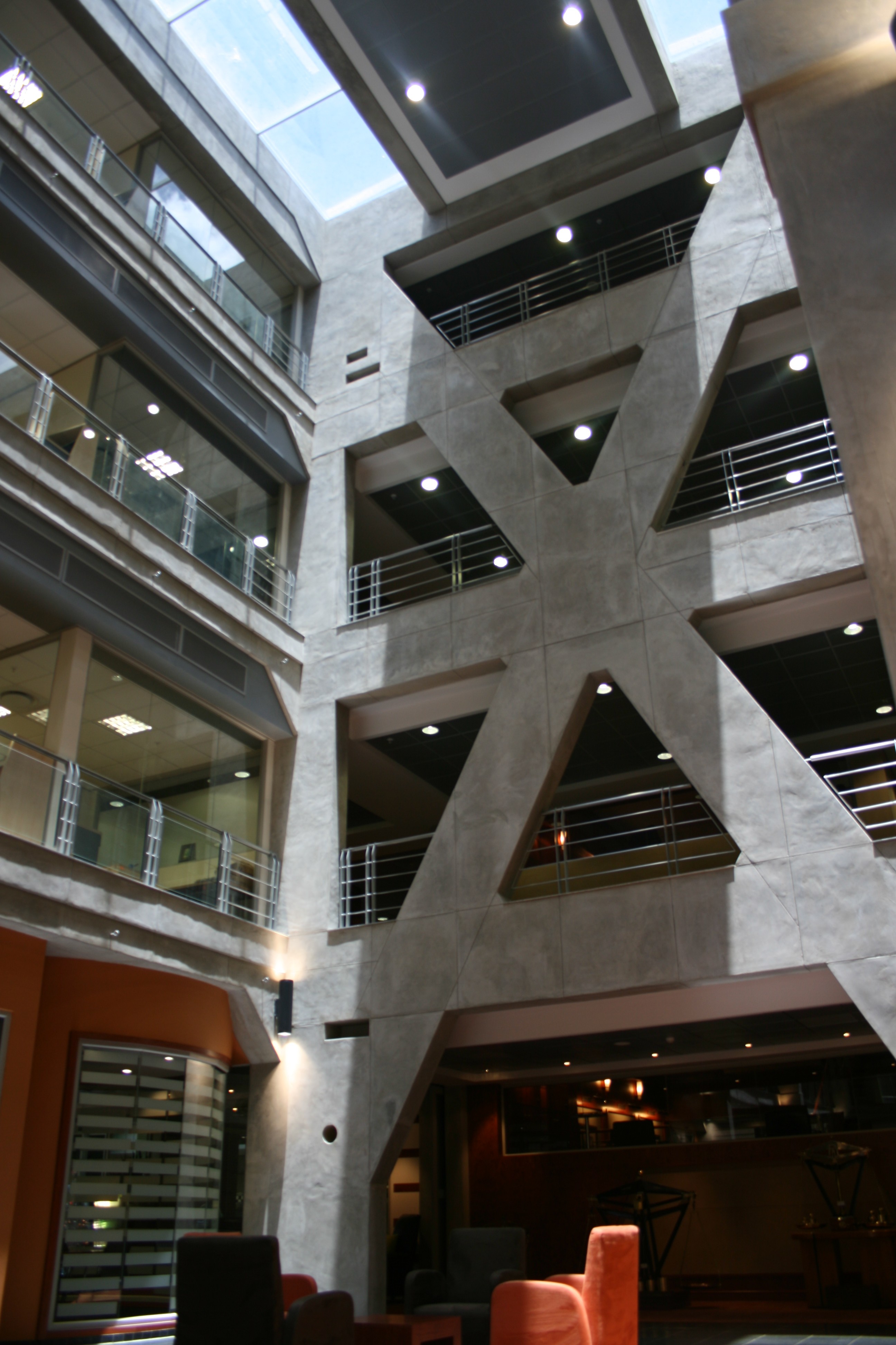 The fundamental concept behind the development was to create a “fat, flat and walk-up” modern functional office for the tenant, preserving as far as possible the “ethos” of the existing power station complex. This was achieved through the demolition of one of the existing structures to make space for the new building and the subterranean parking structure. The offices are arranged in a “figure of eight” plan around two atria, and integrates well with the Turbine