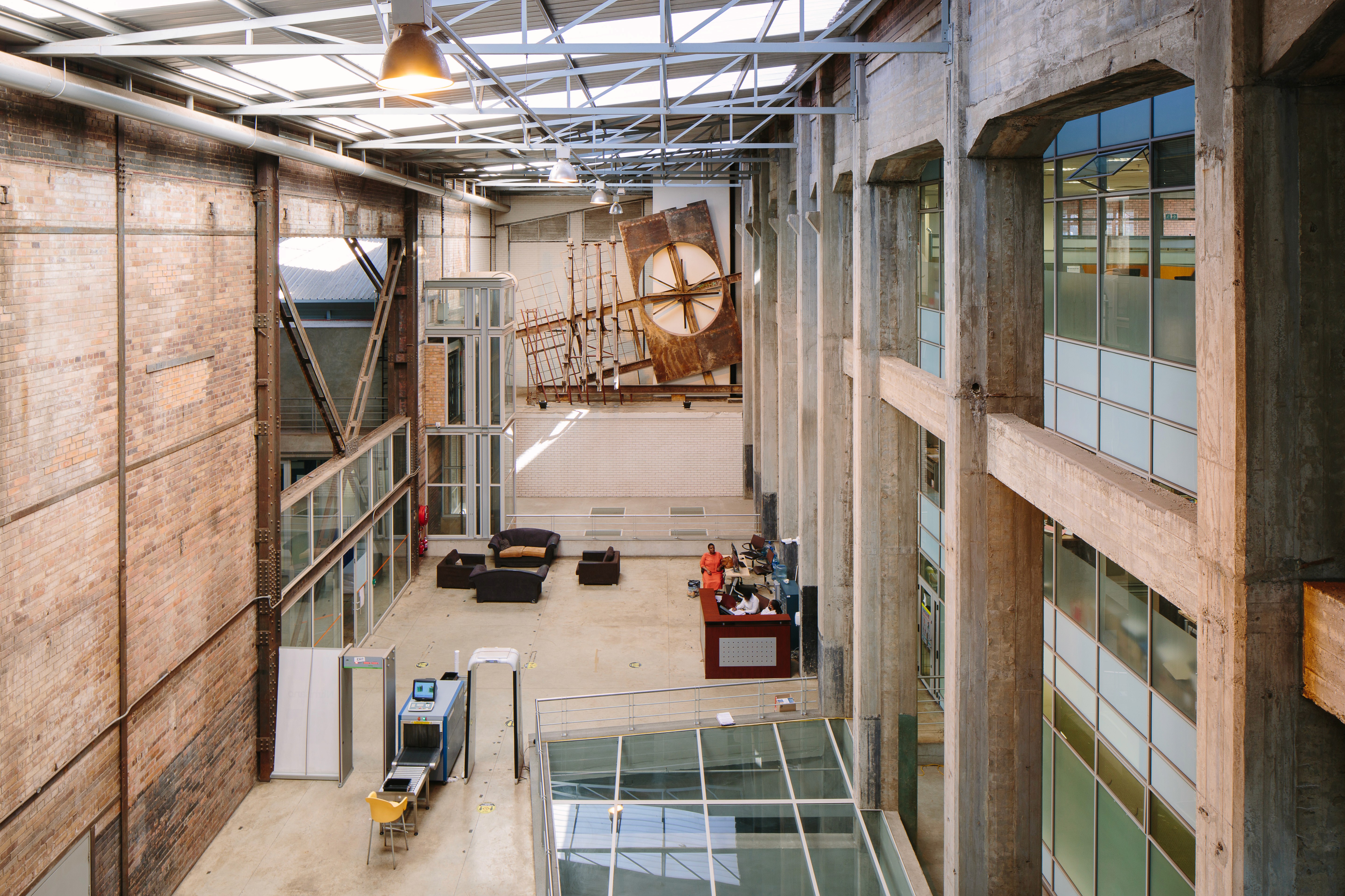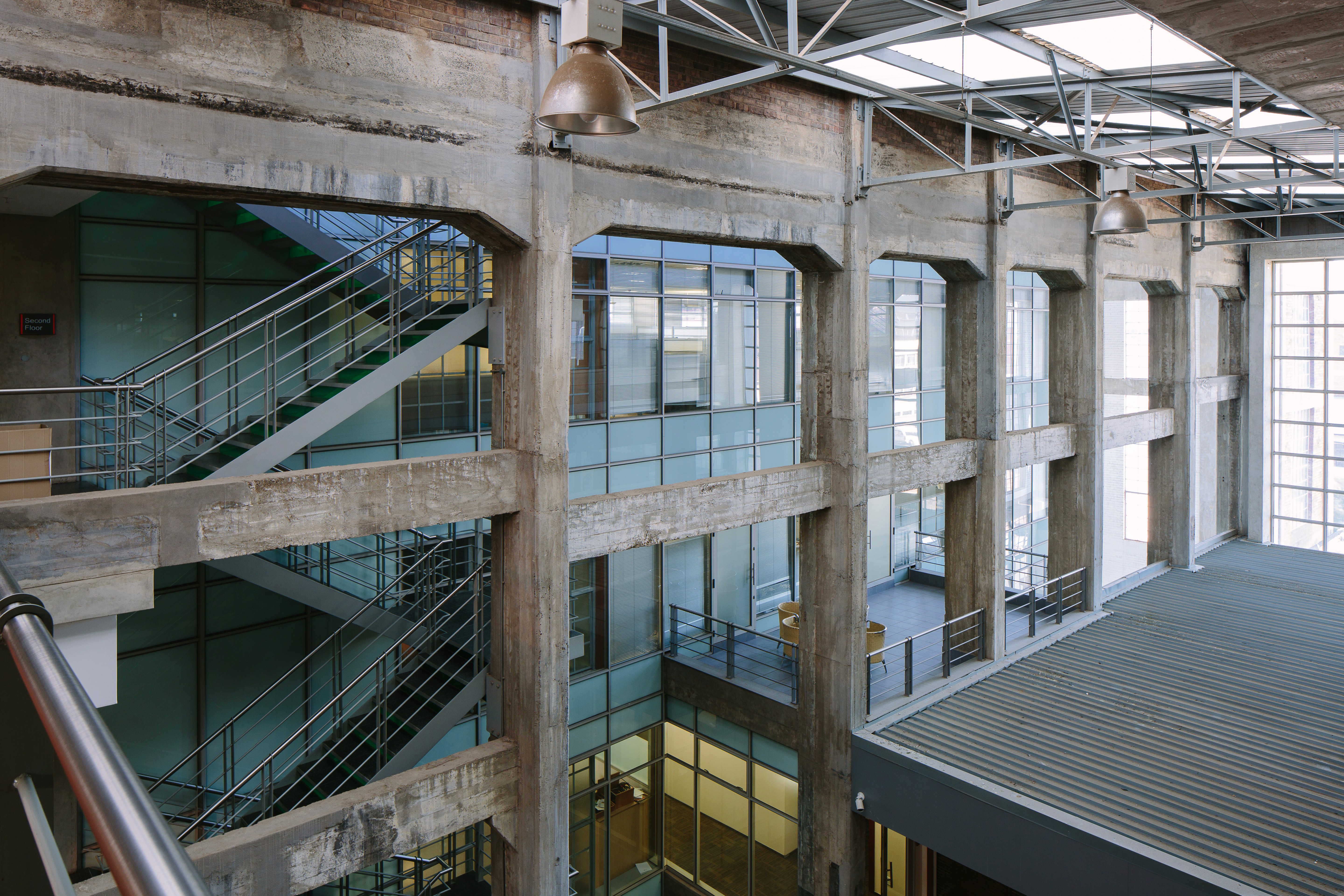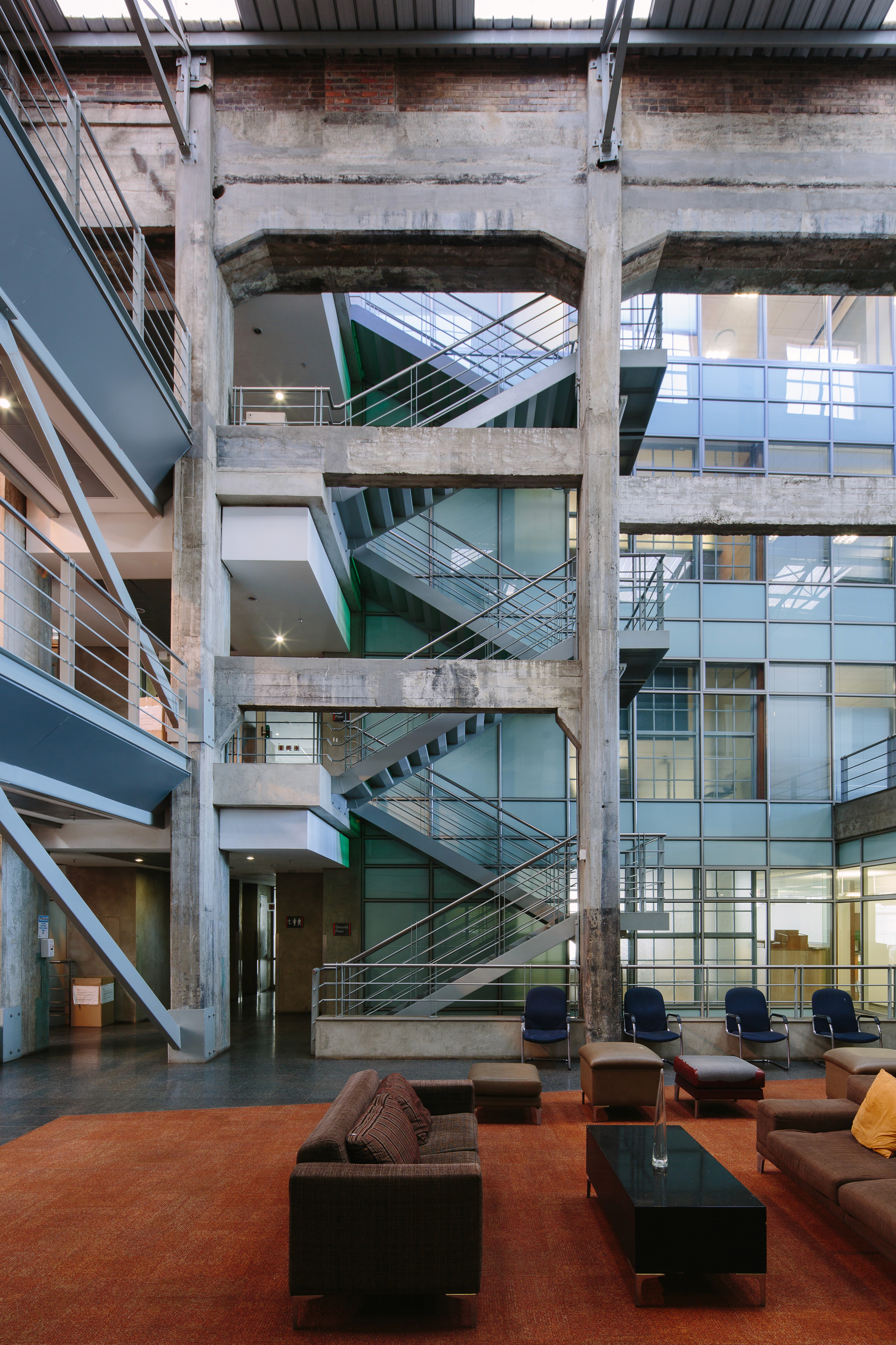 Hall and the South Boiler house to create a set of layered public and private spaces.The existing steel structure to the south boiler house was left in its rusted state to preserve the contrasting original character to the new office space.