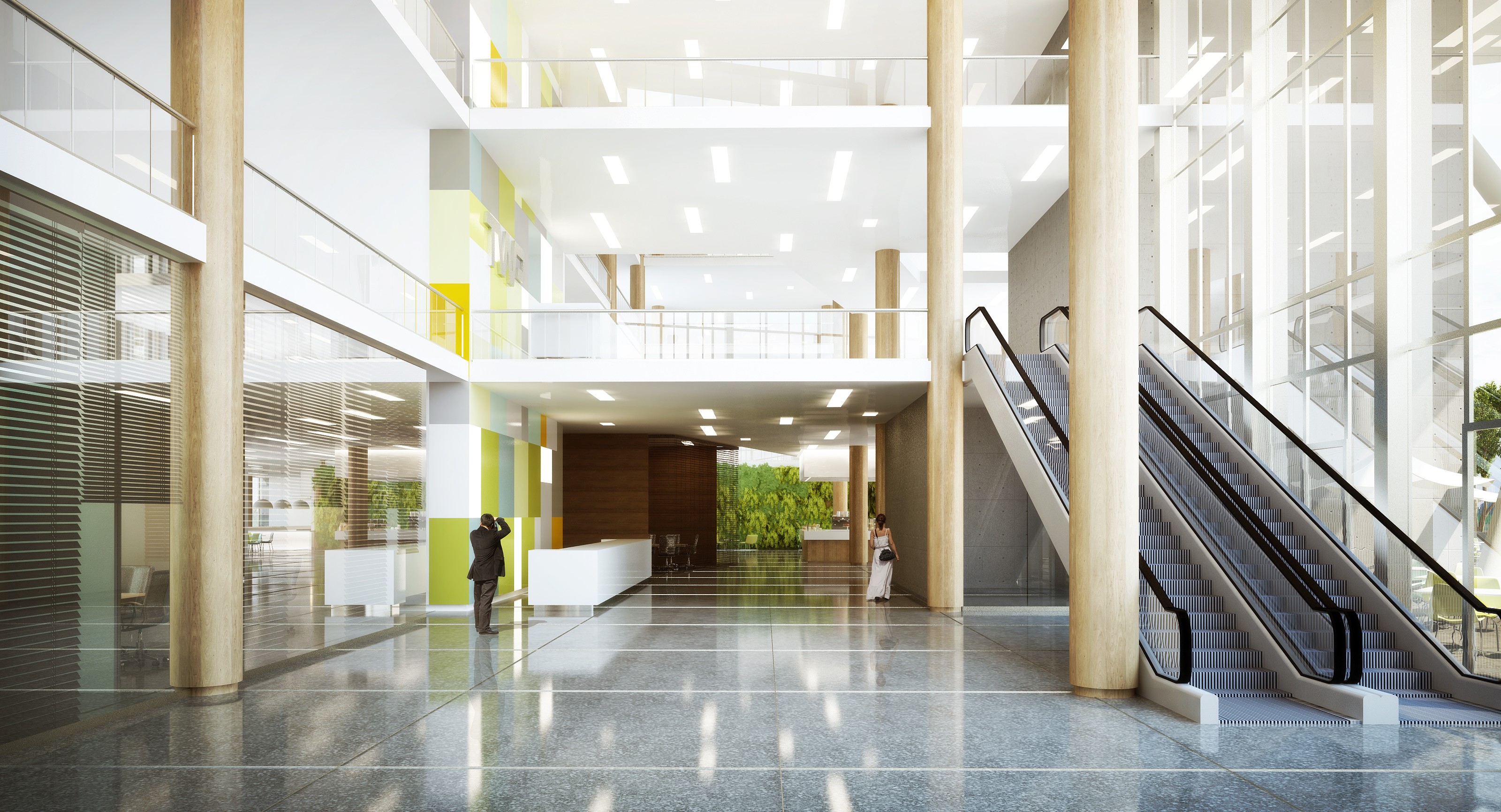 The design opens up the corner entrance of the site, by elevating the upper levels on splayed columns that reconcile the existing structure with the rational grid above. The reception to the meeting rooms was positioned on the corner and opened up with double volume glass to connect the building to the street.